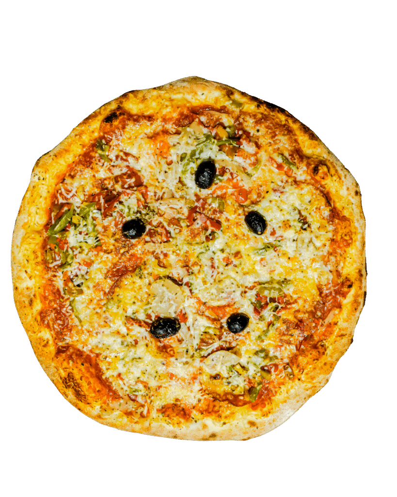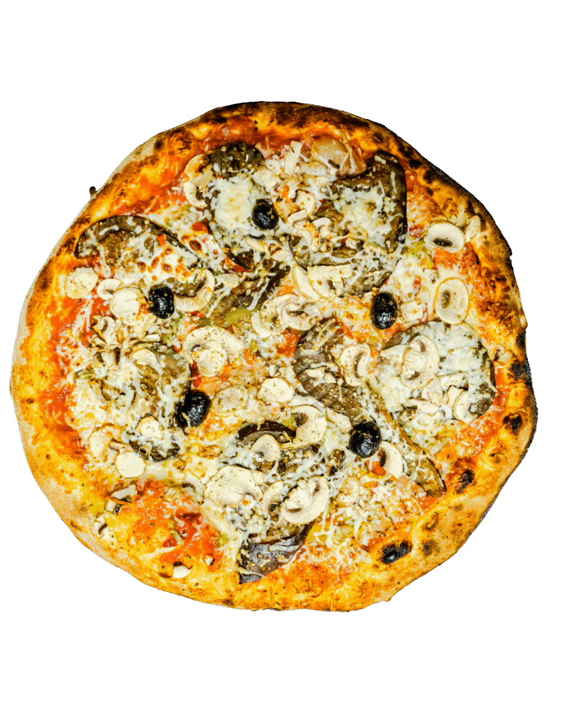 tomate, poivrons, champignons, aubergines, oignons, mozzarella, ail