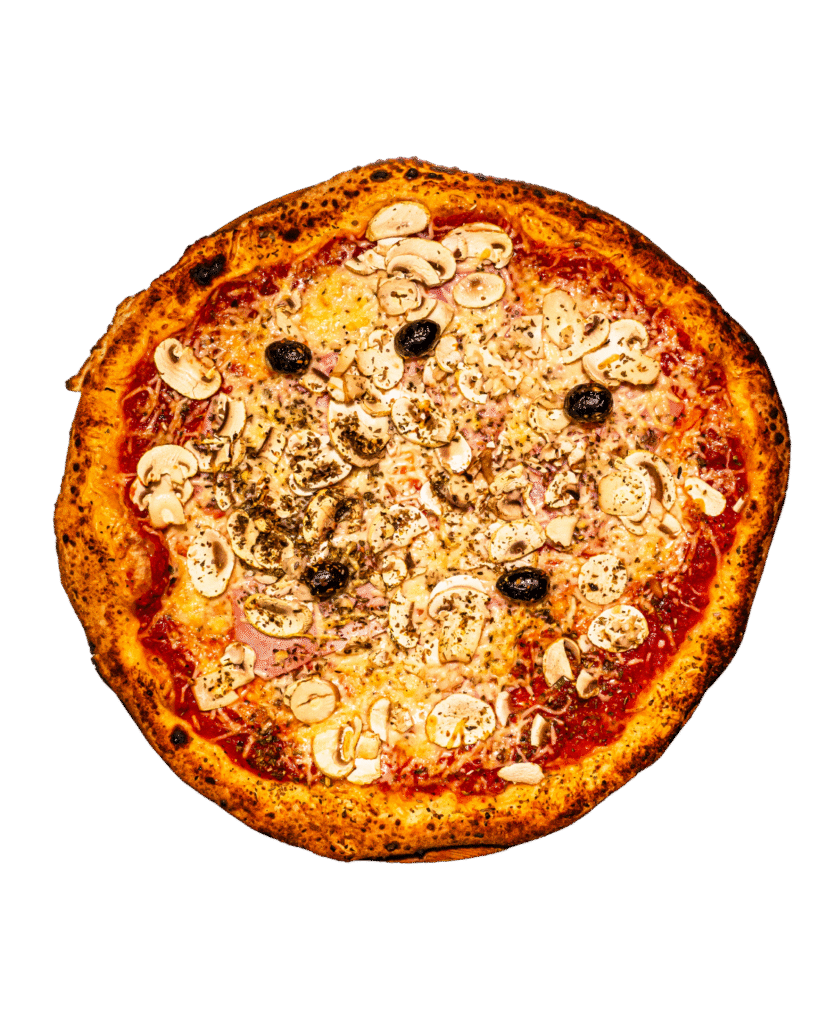 tomate, champignons, jambon, mozzarella, ail