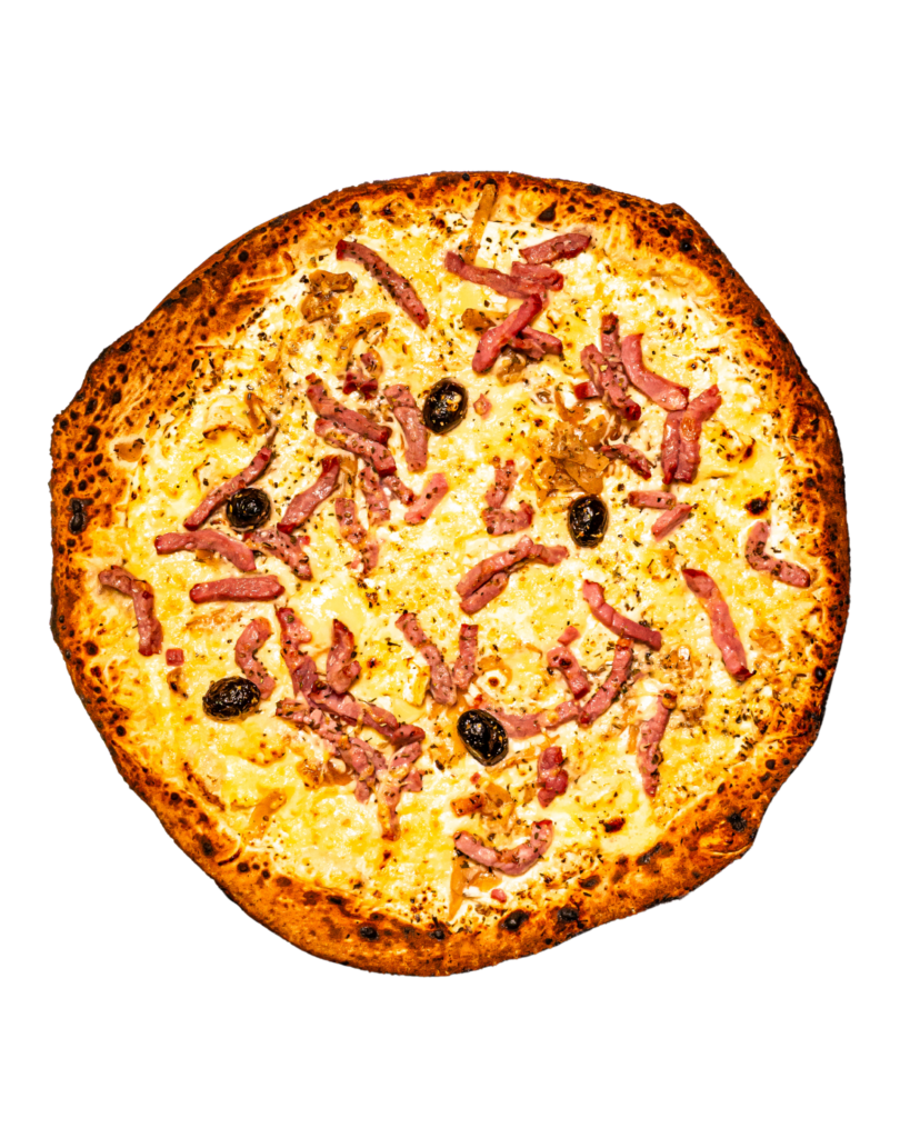 cream, Reblochon, onions, bacon bits, mozzarella